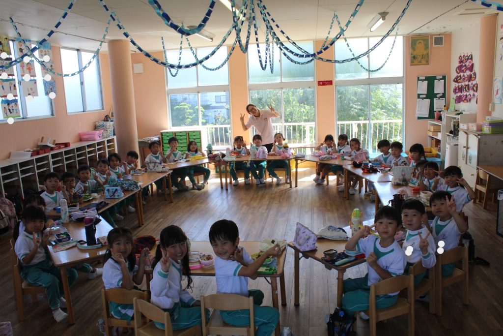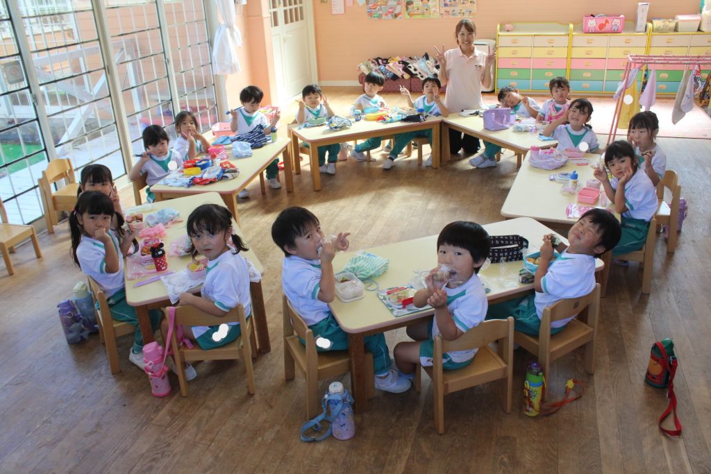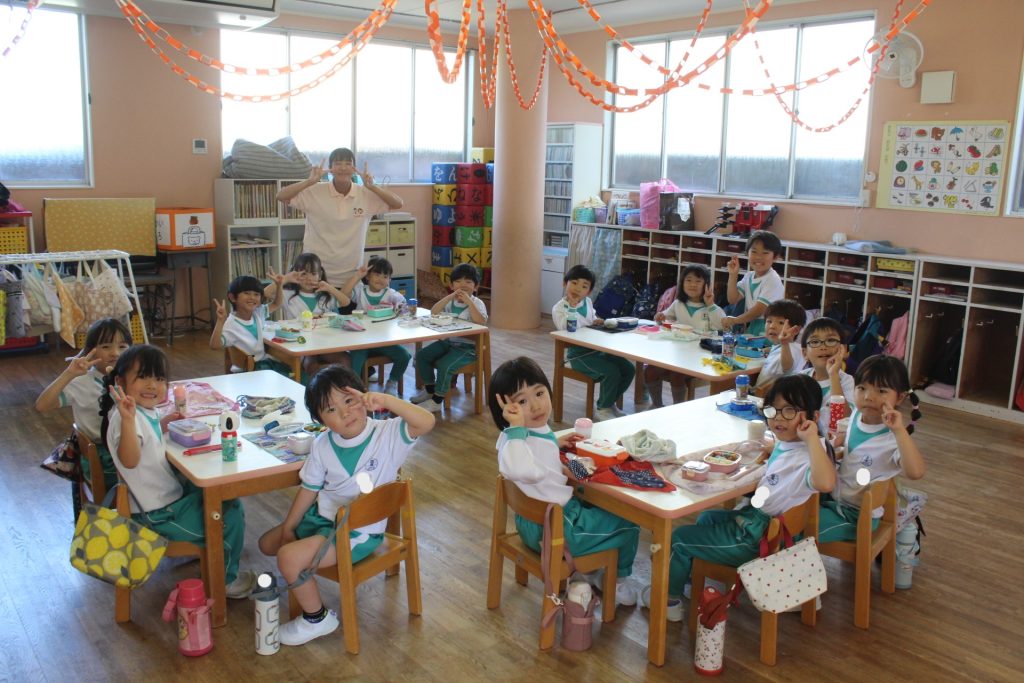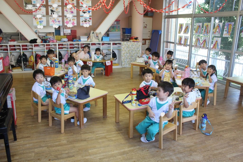 そしてお昼ご飯は芝がベタベタだったので、今回は幼稚園でおうちの方の作ってくださったお弁当をいただきました♪