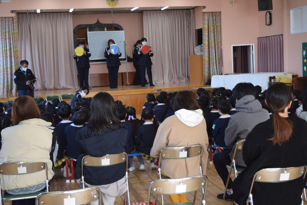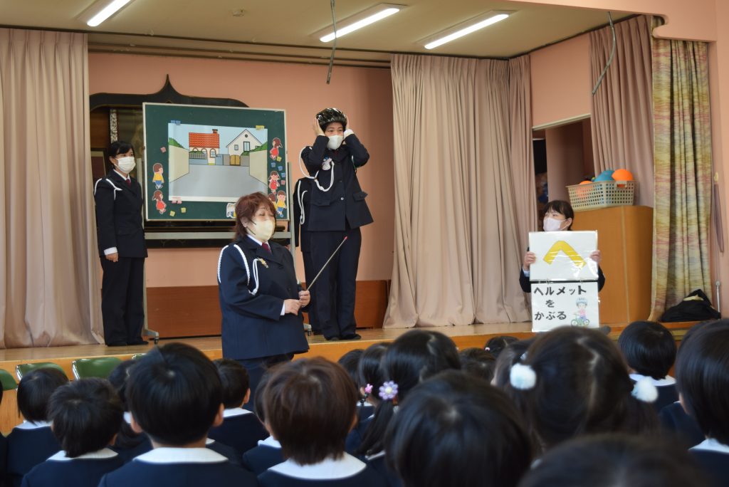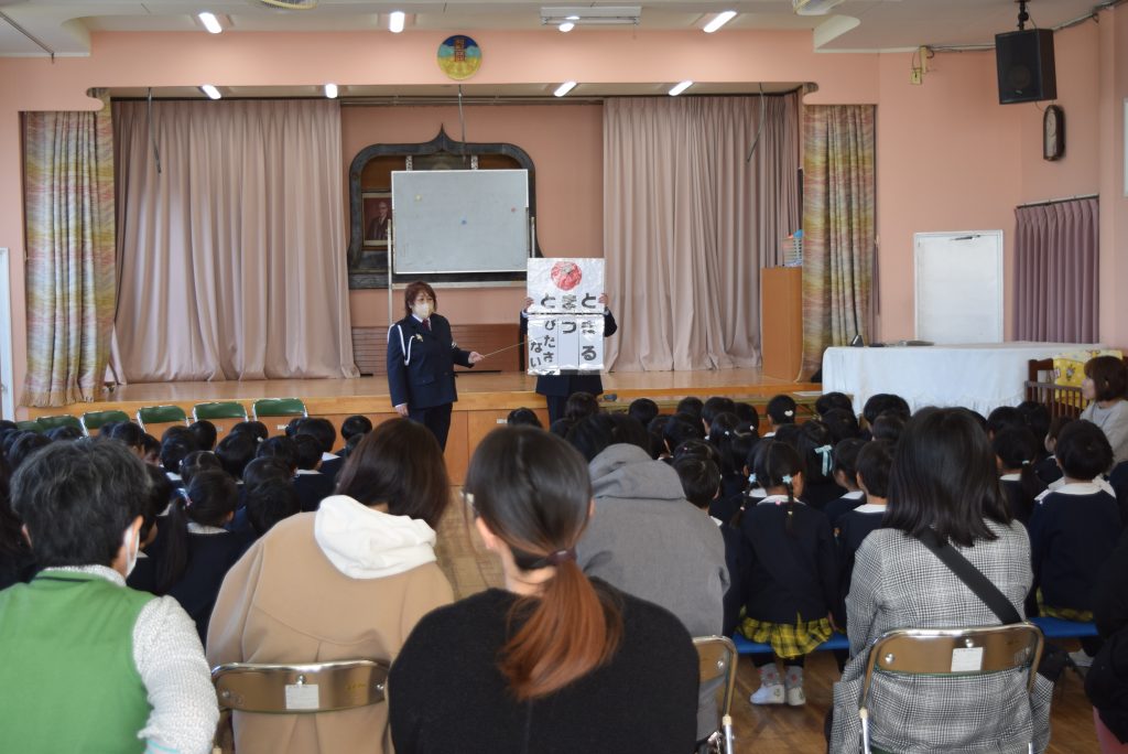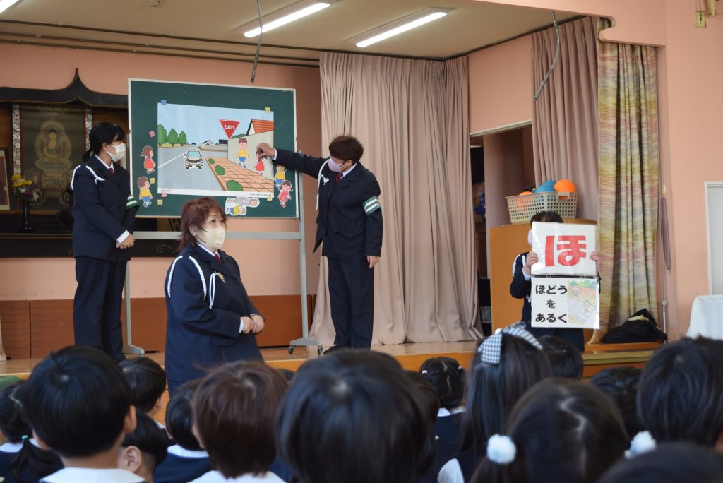 今日は西警察署の警察官、交通指導員の方、西区役所の方が幼稚園にきてくださり、交通安全教室を行いました。