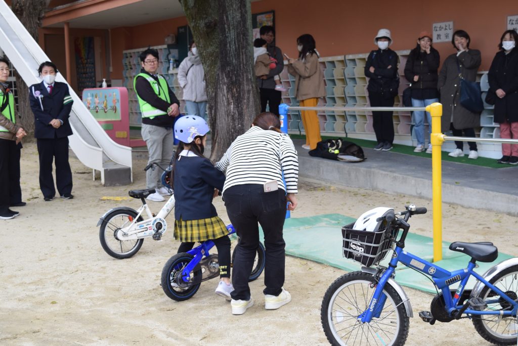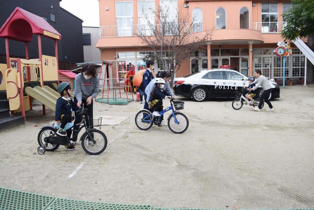 その後、年長さんは警察官の方から自転車の乗り方を聞き、実際に自転車に乗って体験しました🚲
